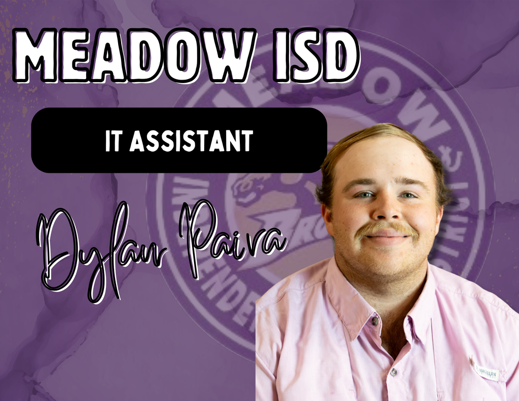 Meadow ISD would like to give a warm welcome to Dylan Paiva, our new IT Assistant! We’re excited to have him join our Bronco family. Welcome to the team, Dylan! 💜💛