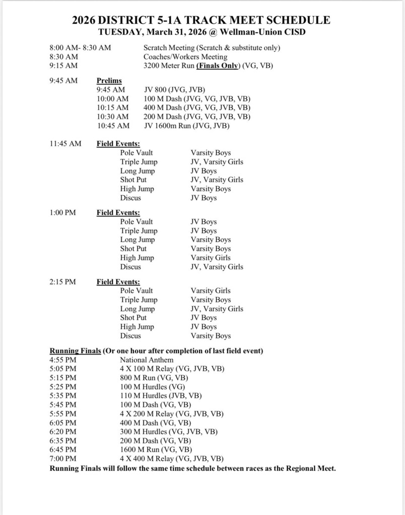 Good luck to our Broncos competing today at the District 5-1A Track Meet in Wellman-Union! 🏃♂️💜💛 Bring home that gold!