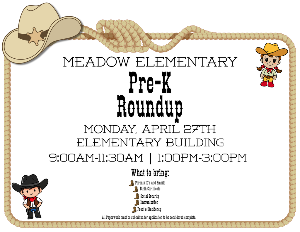 Meadow Elementary Pre-K Roundup will be held on April 27th 🎒🍎